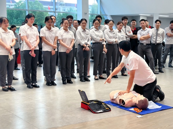 急救知識培訓方面,工作人員以通俗語言圍繞心肺復蘇(CPR)、海姆立克急救法、傷口包扎三大核心技能教學。借助人體模型,工作人員模擬真實場景,細致演示判斷患者意識、呼叫支援、胸外按壓(位置、深度、頻率)、人工呼吸等步驟,并手把手糾正員工實操問題。
